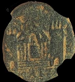 ELAGABALUS AD 218 - 222. Bronze AE 24. Reverse: CE ABI [ΛHNwN K C (Greek: of the Seleucian Abilans, Coele-Syria)], temple with six columns, arched lintel in pediment, lighted altar within, temple flanked by a square crenelated tower on each side, each tower with an arched entryway and three windows.