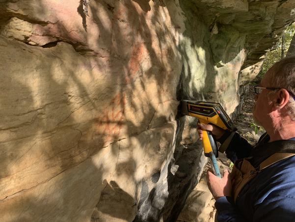 Michael Fuller using a portable XRF detector to test for elements in the paint and nearby unpainted stone. [Photograph by Mark Leach]