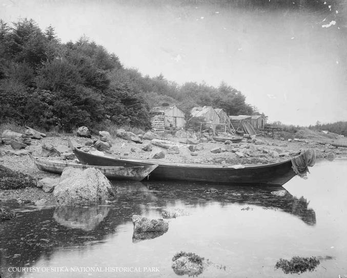 Tlingit canoes photographed by E. W. Merrill in the early 20th century. Photographed from the Sitka National Historical Site database, glass plate negative SITK 25447.