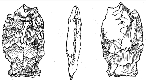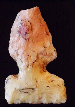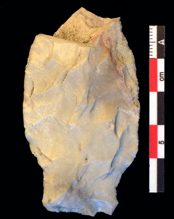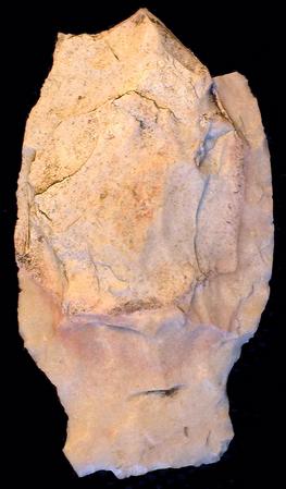 Rice Side Notched point associated with the Chesterfield Valley Shelter. Length = 61.6 mm, width = 34.7 mm, thickness = 11.5 mm and weight = 25.19 grams.