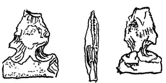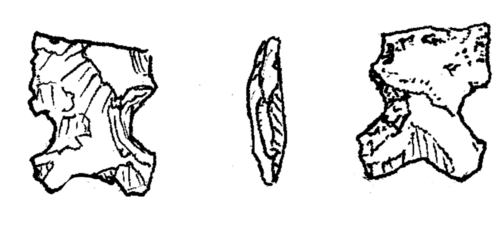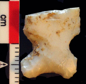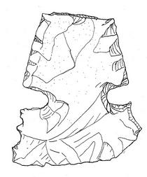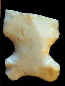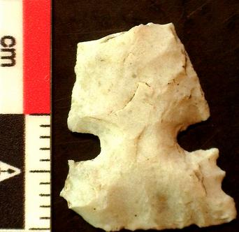 Cahokia point with two notches. Length = 17.4 mm, width = 14.6 mm, Thickness = 2.0 mm, and weight = 0.67 grams. A very delicate point possible broken during manufacturing; the morphology of this point is identical to several Cahokia points from the Dampier Site (23SL2296).