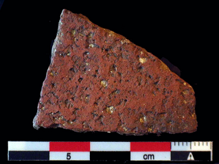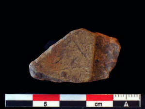 Shell tempered body sherd with a red slip on the exterior. Thickness = 5.2 mm and weight = 7.41 grams. Medium to fine shell temper. 2.5YR4/6 red exterior; 2.5YR5/4 reddish brown core and 2.5 YR3/2 Dusky red interior.