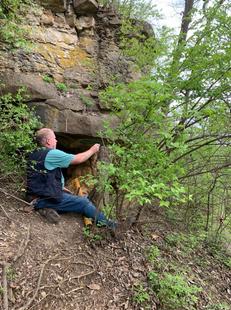 Photographs taken by Mark Leach as I try not to fall off the narrow ledge while documenting the pictograph at the Chesterfield Valley Site. The site is very dangerous to reach because it is situated on a bluff face high above the Missouri River floodplain. The site is on private property and is not open to the public.
