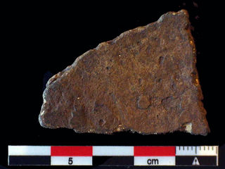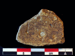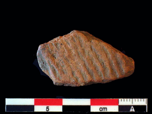 Fabric Impressed/Cordmarked body sherd with limestone temper from Chesterfield Valley Rockshelter. Thickness = 5.0 mm and weight = 3.76 grams. Fine limestone temper. 10R5/6 red interior and core; 10R5/2 weak red interior.