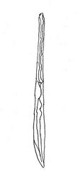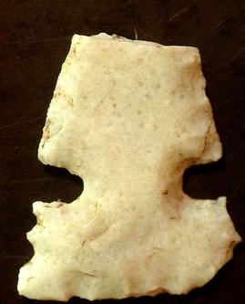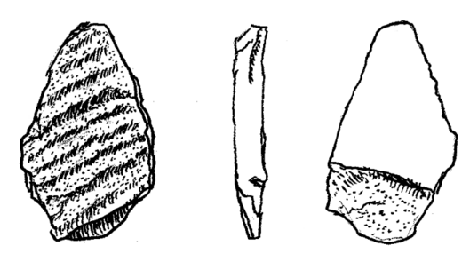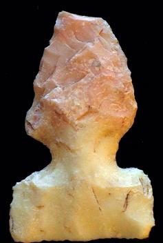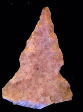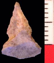 Chert flake that was repurposed into a very small projectile point; possibly, for a child's toy/practice arrow. Length = 12.5 mm, width = 8.4 mm, thickness = 1.5 mm and weight = 0.14 grams.