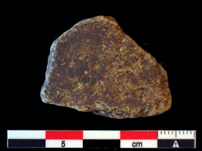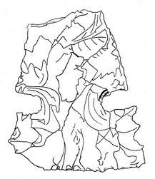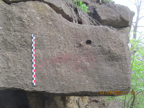 Red Ochre pictograph to the right of the 20 cm. scale. Vandals have spray painted many areas of the cliff face at the Chesterfield Valley Shelter. This one, undamaged exposure of Burlington Limestone still retains a faint pictograph that was discovered by Mark Leach. Scale is 20 cm.