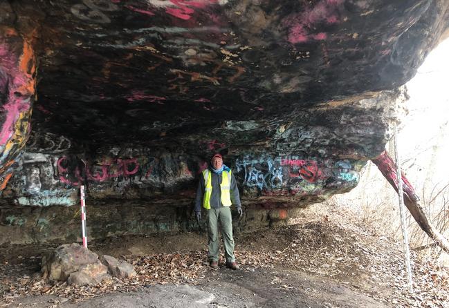 Mark Leach inside the Chesterfield Valley Shelter. The scale on the left side is 1 meter. Vandals have defaced the walls of the shelter and looters have disturbed the soil deposits.