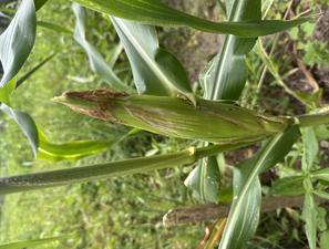 Corn plant no. 4 = 1.5 meters tall, 1 ear at 45 cm above ground. Shriveled; yellow kernels.