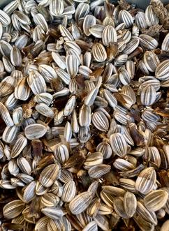 Apache Sunflower - only one plant survived the summer and it had a single head that produced stripped kernels. The head measured 17 cm in diameter and yielded 250 ml of seeds (662 seeds) which had a dry weight of 54 grams. 2.4 meters tall.