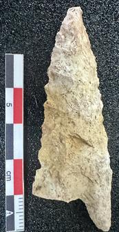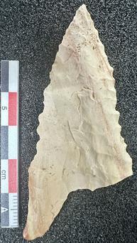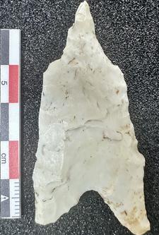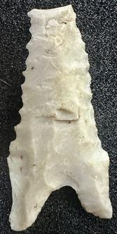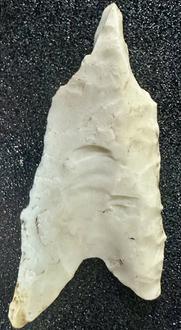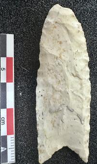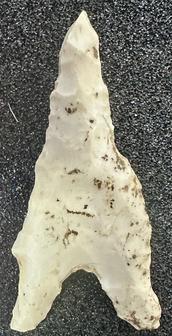 Clovis point manufactured from white chert (probably Crescent?) found on 5 May 2025.
