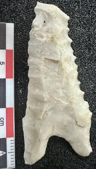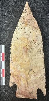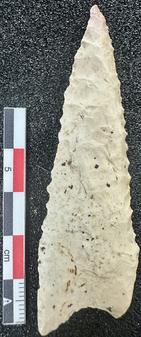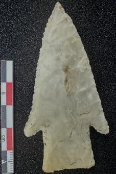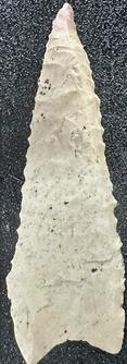 Heavily resharpened Dalton with double burinated tip and alternating bevel. Lateral and basal grinding positive. Length = 50.5 mm, width = 23.9 mm, thickness = 6.5 mm, and weight = 5.9 grams.