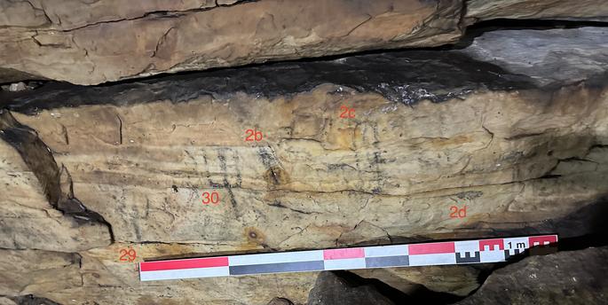 Black Smugde (bat guano?)with red cap (Glyph ????) pXRF 120: Barium = 900.69 ppm +/- 77.96, Antimony = 165.57 ppm +/- 20.52, Tin = 114.64 ppm +/- 17.89, Cadmium = 61.48 ppm +/- 14.42, Silver = 42.95 ppm +/- 10.16, Palladium = 12.56 ppm +/- 7.09, Zirconium = 76.09 ppm +/- 13.51, Strontium = 11.9 ppm +/- 4.18, Nickel = 74.68 ppm +/- 40.9, Iron = 9283.77 ppm +/- 256.39, and Manganese = 116.74 ppm +/- 63.07.